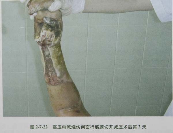 肌肉烧伤伴筋膜腔高压初期治疗。目的是减轻深部组织压力,保存肢体或尽量保存肢体残端长度。适时植皮,避免截肢或尽量保留肢体长度的截肢。