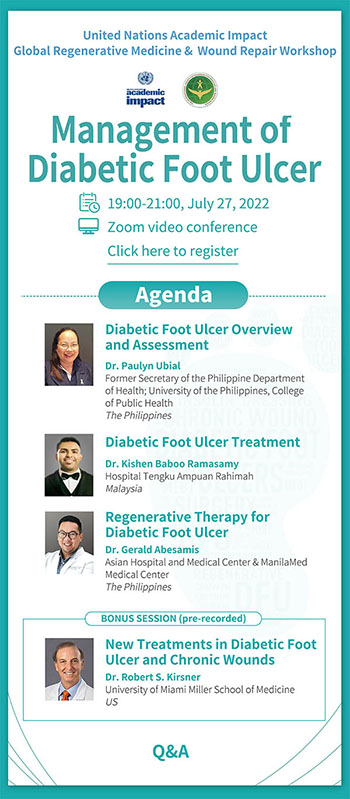 2022年7月27日,由国际再生医学与创面修复学会(ISRMWR)主办的“联合国学术影响力国际再生医学线上培训——糖尿病足管理”顺利举行。此次培训,共有来自全球近300名医务工作者注册参会,参会人员来自中国、马来西亚、印尼、印度、菲律宾、新加坡、秘鲁、厄瓜多尔等国。
