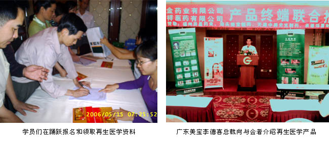 06年初,广东美宝总裁和他所带领的团队,围绕医疗技术学术普及和产品终端推广这两个中心积极展开工作。积极筹备、组织和举办了形式多样的再生医学技术培训班、学术讲座和药店终端产品推广会等活动。在医疗开发上,利用再生医学的强大技术优势对市、县、乡、镇各级医院进行扎实的“地毯式”开发,同时充分利用总部专家团队的优势资源和地方卫生部门的大力支持,成功组织临床会诊,完成多次抢救任务,获得可喜的成绩。组图一、5月12日,以花都区中医院为依托、花都区中医学会牵头组织,成功举办广州市“再生医学及临床技术规范”培训班,有来自20多个医院的100余名医师参加培训。