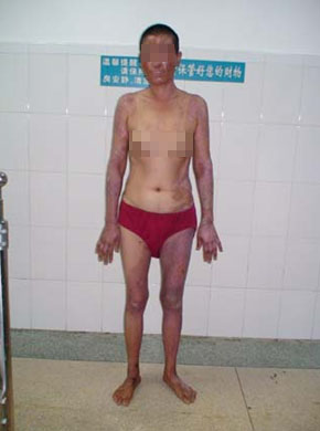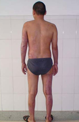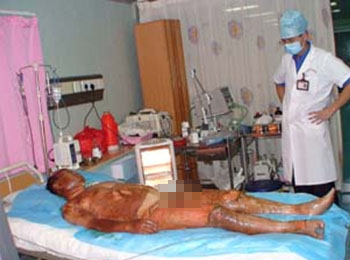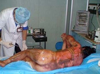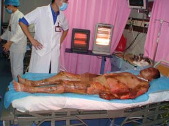 2006年9月11日晚7点,广州花都中医院ICU病房急诊收入两例成人大面积烧伤患者,该两例患者为该区某造纸厂工人,在入院前1小时,工作中因蒸汽管道泄漏致蒸汽烧伤。病例一、患者江某、男36岁,入院诊断:全身蒸汽烧伤总面积70%(浅二度15%、深二度45%、浅三度10%);病例二、患者江某、女、42岁,入院诊断:全身蒸汽烧伤总面积72%(浅二度7%、深二度50%、浅三度15%)。患者入院后,该院立即成立了以主管院长刘树华和大外科主任张向东为首的抢救领导小组,并邀请北京美宝烧伤创疡研究所王洪生研究员进行全程临床指导,对该两例患者创面处理全程采用烧伤皮肤原位再生医疗技术,结合全身抗休克、抗感染、营养支持、脏器功能保护等综合治疗,经过一个月的治疗,两例患者顺利渡过休克关、感染关,浅、深创面均实现了表皮化愈合,目前,该两例患者烧伤已痊愈,正在该院接受康复期治疗。