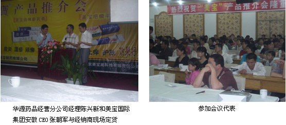 在这收获的季节,美宝国际集团和安徽华源医药股份有限公司联合在安徽太和镜湖宾馆举行美宝国际集团产品推介会。选择在这时举办此次活动主要目的是加深美宝国际集团和安徽华源医药股份有限公司之间的相互了解和信任、向各级经销商介绍在世界生命科学领域中处于霸主地位的美宝国际集团及其高科技含量的系列美宝产品,使大家更全面、更深入地认识再生医学及系列产品,为即将到来的美宝产品销售旺季作好准备。