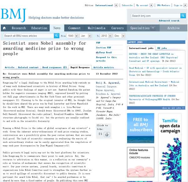 对于像徐荣祥这样的科学家来说,公众抗议和法律诉讼可能不是发表观点、寻求正义的最好平台。但是,这种求助于法律仲裁的手段却反映了我们作为那些确保科学成就获得应有认可的各机构的委托方在发挥作用时是存有问题的。我们的同行审查系统、杂志董事会、科学委员会以及像诺贝尔委员会这样的组织都需要进一步加强体制以避免科学领域内的纷争流溢到社会公共领域;特别是对诺贝尔奖这样的奖项而言,这样的奖项不能授予给已去世的人、也不能被超过一定数量的人所共享。英国医学杂志(BMJ)能发布这一诉讼消息就已然说明科学杂志也应履行起“看门人”的职责而不只是承担“啦啦队长”的责任。
