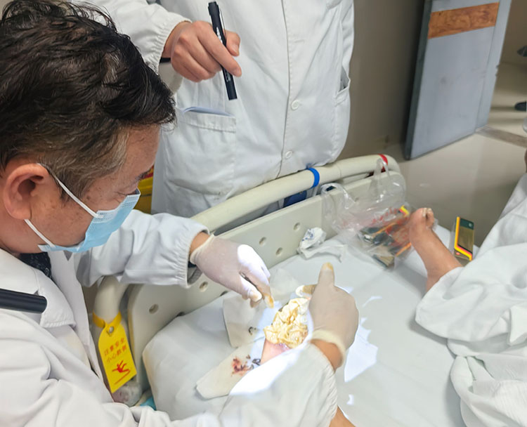 2025年10月30日,《中国烧伤创疡杂志》编委、烧伤创疡再生医疗技术临床专家张强主任应邀前往定远县总医院创面修复科,会诊多例糖足和创面患者。张主任深入病房指导并示范再生医疗技术规范化临床应用,结合患者病情制定后续治疗方案,受到医护人员高度赞赏。