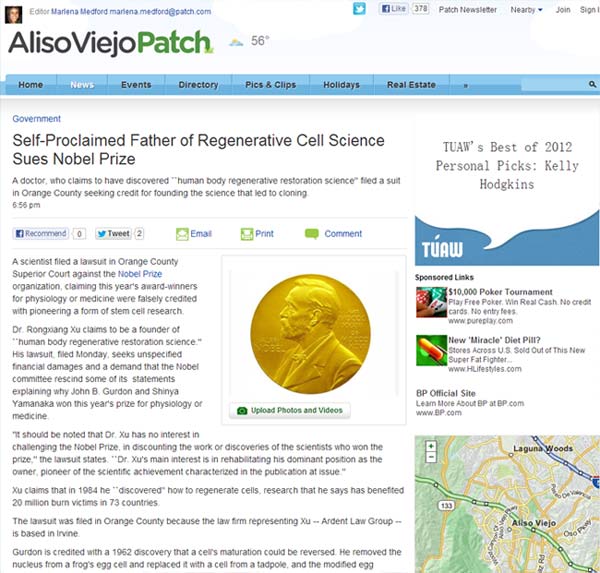 注:原文链接http://alisoviejo.patch.com/articles/self-proclaimed-father-of-regenerative-cell-science-sues-nobel-prize