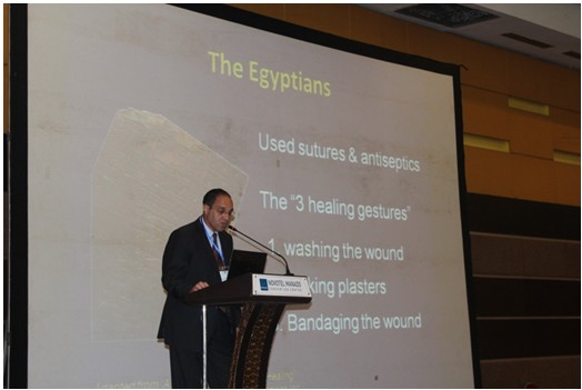 随后,来自埃及的亚历山大大学外科教授和再生医学专家Dr. Sakr, 再次受邀登上大会的讲台,讲述在埃及创面治疗的历史和未来趋势。Dr. Sakr,博古通今,旁证博引,系统地介绍了从古至今的各种创面疗法,包括用蜂蜜,茶叶,植物油等的应用;重点论证了湿性疗法的合理性和优势,并将再生疗法列入关键的创面治疗发展史,展示了各种创面的对症处理,并结合创面的生理及病理变化过程讲解了再生疗法。最后,他指出再生疗法是创面治疗的未来和趋势。