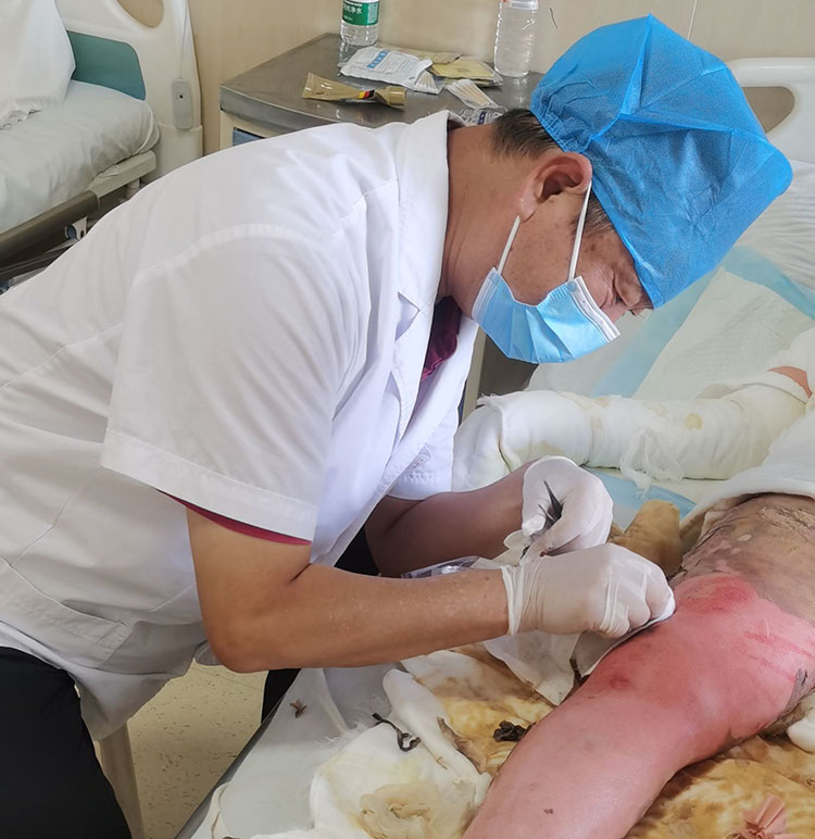8月18日,应河北魏县中医医院之邀,再生医学知名专家、《中国烧伤创疡杂志》常务编委赵瑞庆主任,在该院会诊了三例创面患者(下肢外伤皮肤深部感染、脑出血合併巨大压疮、肢体多部位沥青烧伤),并亲自演示了操作程序,在讨论环节提供了一对一的治疗方法。