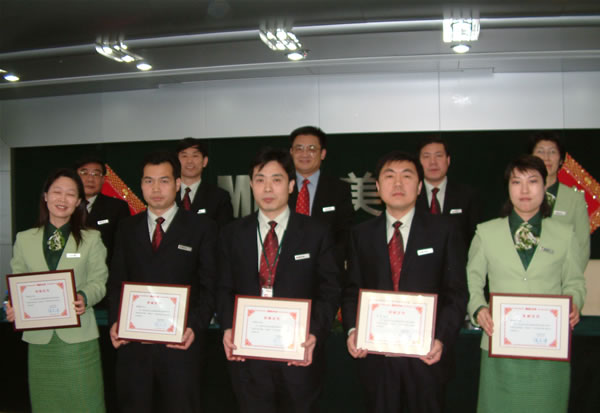 2月7日上午市场板块会议进行表彰工作,由陈宝琪董事宣读了集团董事局关于授予李德喜等五位同志为“美宝绅士”荣誉称号的决定。这是集团实行“美宝绅士”年度评审制度后的首次任命。李德喜、李春凤、王洪生、汪波、彭韶军等五位同志由董事局主席徐荣祥教授颁发奖牌。徐总号召大家向美宝绅士学习,弘扬汪波、李春凤的精神,今后各系统都要实行绅士年度评审制,为集团的发展作出突出贡献的人员是集团全体员工的榜样。