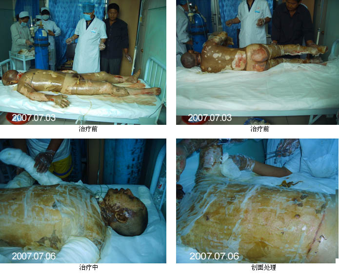 2007年7月1日该院又成功的救治一批特重度烧伤病人,共2人:患者,慕某:男:43,7月1 日7时:火焰烧伤2小时后入院,查:深Ⅱ゜25%,Ⅲ゜70%。TBSA95%。 合并重度吸入性损伤,会诊后气管切开,面积分布为头面颈部,双耳、躯干、双手、双上肢,躯干部,臀部,及双下肢,双踝烧伤,创面有大量小水疱,其中双上肢,面颈部,创面苍白,痛觉消失,鼻毛烧焦,鼻黏膜苍白,声音嘶哑。吸出黑色粘痰。诊断。1、特重度烧伤。2,吸入性损伤。 3,低血容量休克。中国烧伤创疡研究所医疗部金党军主任于7月1日接到会诊电话后及时赶到该院,在胡总多次电话指示下,同姜主任结合临床危重病人的病情,制定出周密的治疗方案:1、抗休克、2、抗感染、营养支持。3、创面全程应MEBT/MEBO、4、气管切开。5、雾化吸入4次/日。6、预防各种并发症(对急性应激性胃溃疡作了及时处理,很快得到控制)。7、对深度创面进行耕耘,簿化相结合减张术,充分发挥MEBO的药理作用,创造生理性湿润环境,挽救间生态组织,激活潜能再生细胞,通过无损伤地液化排除坏死组织,培植组织干细胞,实现组织器官的原位再生修复,达到无瘢痕愈合。目前,患者病情稳定正在治疗中。