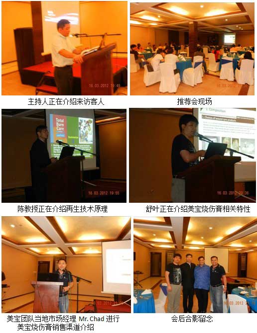 结束完在菲律宾长滩岛举行的第十六届东南亚整形外科大会后,美宝团队在当地代理人员的陪同下,于2012年3月15-20日在菲律宾南部三大城市:Cebu,Cagayan和Davaos进行2012年度首轮医疗开发。美宝团队由来自中国烧伤创疡科技中心临床部主任、北京荣祥再生医学研究所副所长、北京中西医结合学会烧伤专业委员会副主任委员、中国烧伤创疡杂志社副社长的陈永翀教授,美宝国际市场集团产品部主管舒叶,菲律宾代理市场经理Mr. Chad, 技术支持人员Dr. Mark组成。下面综合报道如下: