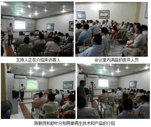2012年3月15日早上10点,在当地人员带领下,美宝团队走访了Cebu城市几个大型的政府或私立医院,这几家大型医院正在尝试使用再生技术和产品。其中,Dr. Mirela是重点培养的医生,她是当地Cebu City Medical Center(宿务市医疗中心)主管院长,她于去年6月到四川学习再生医疗技术两周时间,深入了解到再生疗法在中国的使用情况并学到了纯正的再生技术。回国后,她积极致力于再生技术在当地的使用。通过她个人的影响力安排中国专家在当地整形外科例会上正式推广再生技术及产品。晚上7:40,宿务整形外科例会按时召开,当地各级别整形医生共计44人参加了此次例会。陈永翀教授为大家讲授再生医学临床使用方法,舒叶介绍美宝烧伤膏产品知识,整个例会持续了近3个小时。在最后的提问环节,与会医生就再生医学相关问题同美宝团队成员进行了深入的交流。最后Dr. Mirela总结说,她非常感谢中国客人的到来,但更要感谢的是带来了这么完美的技术,她本人在中国学习了两周,亲眼见证了再生技术在中国的神奇应用,现在有很多她的病人都在这项技术的帮助下康复,非常感激那次的学习旅程,使她见识到了不仅中国人的热情还有中华民族强大的医学文化底蕴。