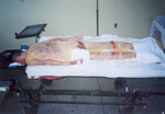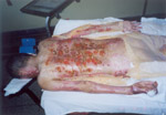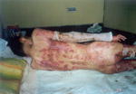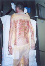 伤后半年,全身遗留药15%残创未愈,创面用利福平纱布湿敷