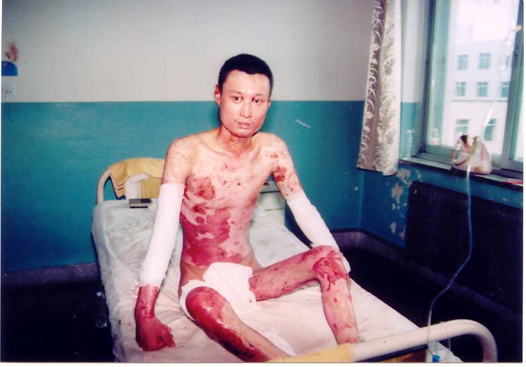 2004年6月29日10时,邵某,男,28岁,被汽油火焰烧伤全身多处,烧伤面积80%、其中浅II度61%、深Ⅱ度-浅度19%、创面分布:头颈部,躯干及四肢,面部及四肢肿胀,鼻腔黏膜苍白、声音嘶哑、大部分创面腐皮脱失,创面红白相间,查体:体温37.6℃、脉搏130次/分、呼吸26次/分、血压130/80mmHg、WBC21×109/L:诊断:1、特重度烧伤,2、中度吸入性损伤,伤后曾在市某医院治疗,创面外涂磺胺嘧啶银,其它治疗不详。天后由于病情不稳转入本院治疗,情况危急,当时正在牡丹江市一院救治病人的中国烧伤创疡科技中心临床部金党军主任接到电话后迅速赶往吉林武警医院,会同曹桂军主任及全科医护人员结合临床对病人病情进行综合分析;拟定治疗方案:1、调整抗生素加大抗感染力度;2、全血400㏕静滴,一次/隔日,3、营养支持;4,对创面清创处理,全程应用烧伤皮肤再生医疗技术;5、对症处理。目前患者住院28天,临床基本治愈。 2004年7月16日17时,卢某,男,44岁,化学物品爆炸烧伤,在某医院临时处理创面,外用磺胺嘧啶银,其它治疗不祥,2小时后转入本院,查体:体温:36.2℃,心率:160次/分,呼吸:26次/分,呈痛苦面容,躁动,意识不清。烧伤面积70%其分布为,头面部4%(深Ⅱ度3%,Ⅲ度1%),颈部深Ⅱ度2%,躯干部21%(浅Ⅱ度16%,深Ⅱ度5%)。双上肢12%(浅Ⅱ度8%,深Ⅱ度4%),双下肢19%(浅Ⅱ度15%,深Ⅱ度24%),双足6%(深Ⅱ度3%,Ⅲ度3%)。躯干和四肢创面有数个大小不等的水泡,部分皮肤脱失,可见网状毛细血管网,头面部、颈部肿胀明显声音嘶哑,双耳,双手,双足部分创面呈黄白色,表面干燥质硬,皮革样改变,焦痂下可见粗大的血管网。诊断:1、特重度大面积烧伤、2、休克、3、吸入性损伤。结合临床病情拟定治疗方案:1、对症处理;2、创面全程应用烧伤皮肤再生医疗技术。目前患者生命体征平稳,正在治疗中。 |